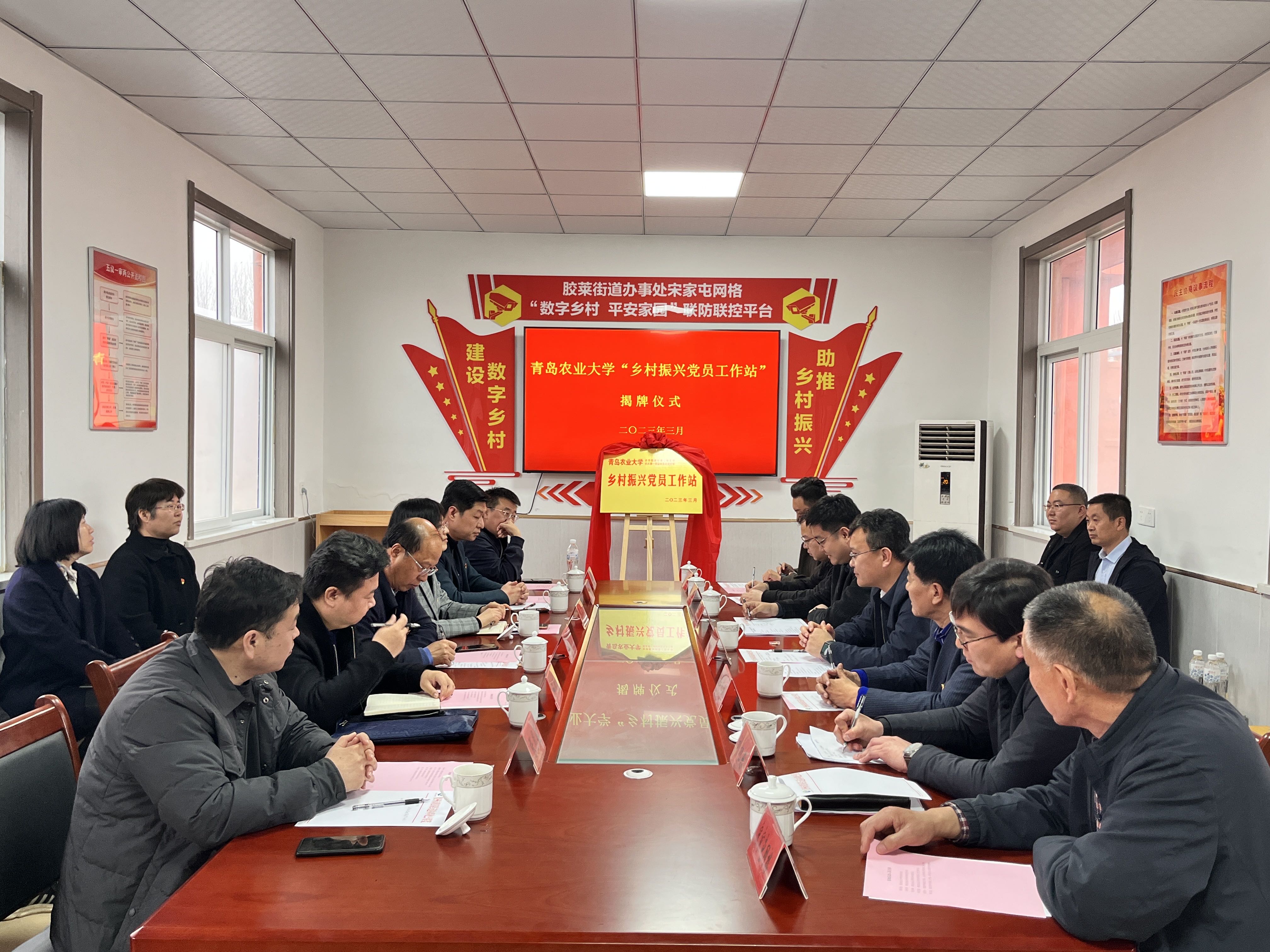 为进一步提升基层党建工作水平,实现校地党建资源共建共享,3月22日,万象城allwincity官网机关一财务处党支部书记、处长蒋家慧,万象城allwincity官网党委书记马伟萍,财务处副处长孙显峰,万象城allwincity官网第二(教工)党支部书记张恩盈及部分师生代表一行赴胶莱街道宋家屯参加“乡村振兴党员工作站”揭牌仪式。胶州市省派驻村第一书记和工作队队长张原生、刘文星,胶莱街道党工委书记刘井哲,党工委副书记刘旭东,胶莱乡村振兴工作队队长吴焕明、刘福临等一同参加仪式。仪式由胶莱街道党工委副书记刘旭东主持。