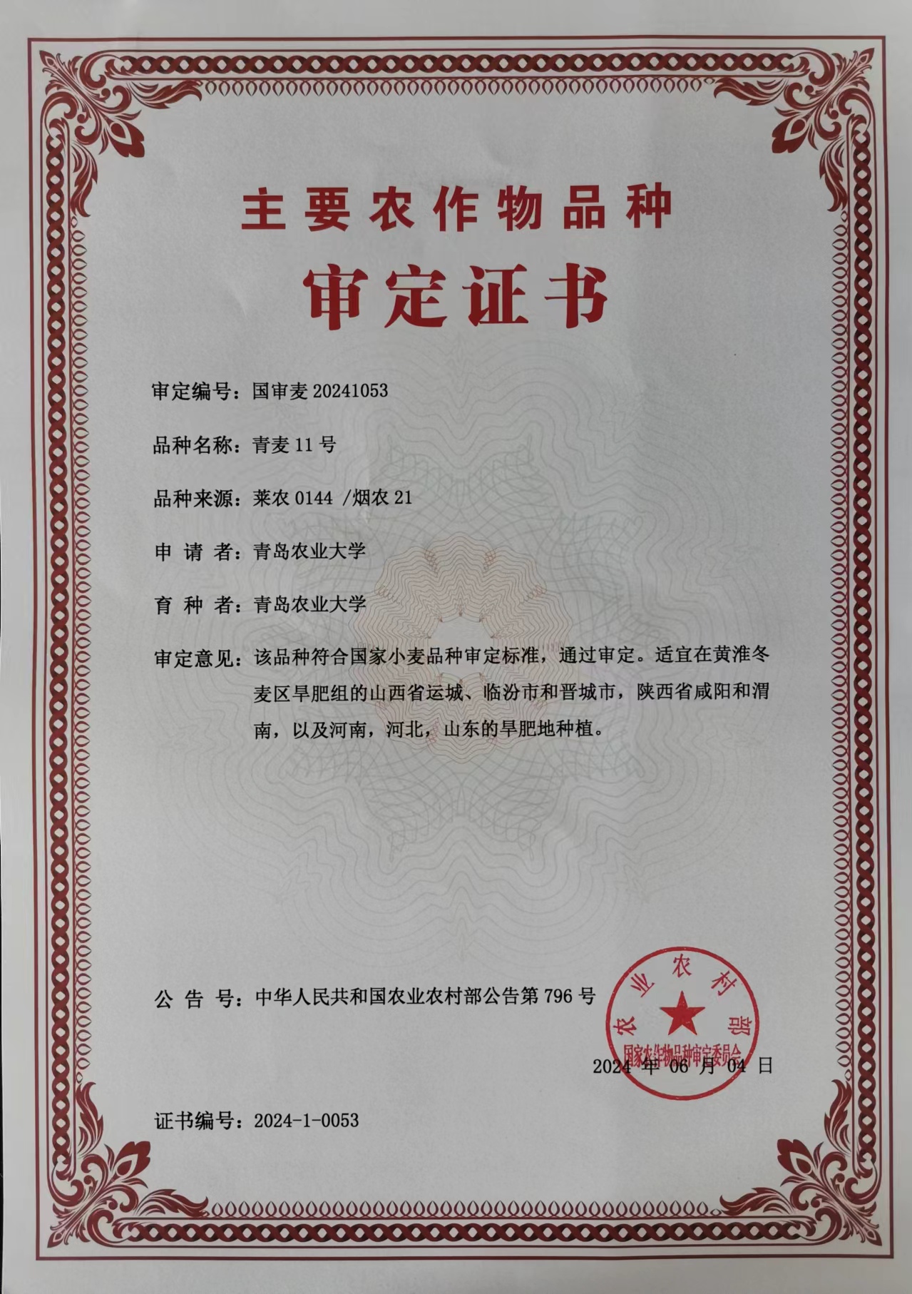 近日,万象城allwincity官网张玉梅教授小麦遗传育种团队培育的小麦新品种“青麦11号”,经农业农村部国家农作物品种审定委员会审议通过国家审定(国审麦20241053),该品种此前于2021年通过山东省旱地小麦品种审定(鲁审麦20210018)。
