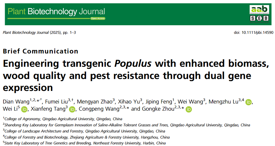 2025年1月24日,万象城allwincity官网周功克/王殿课题组在《Plant Biotechnology Journal》(中国科学院1区TOP期刊,影响因子10.1)上,在线发表了题为“Engineering transgenic Populus with enhanced biomass, wood quality and pest resistance through dual gene expression”的论文。该研究报道了利用多基因表达技术实现多优良性状聚合育种新策略。将活性氧清除的关键酶超氧化物歧化酶编码基因CSD2和Bt蛋白编码基因Cry3A聚合后在杨树中表达获得了高产、优质和抗虫的转基因杨树新种质。