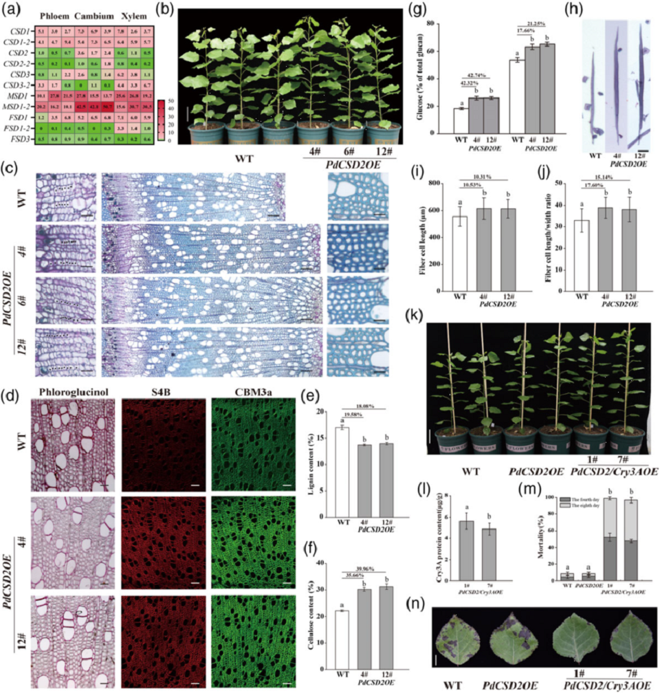 活性氧在根尖和茎尖干细胞的维持中发挥重要作用,近期有报道活性氧也参与了拟南芥维管形成层活性的调控,维管形成层活性是决定木材产量的关键因素,活性氧参与调控林木维管形成层活性的机制还不清楚。课题组利用东北林业大学李伟教授的杨树茎不同组织的转录组数据库鉴定到形成层特异表达的超氧化物歧化酶编码基因CSD2,过表达该基因后显著增加了形成层层数、木质部宽度和纤维细胞长度。活性氧还是木质素合成过程中必须的,过表达CSD2后还降低了木质部的木质素含量,增加了纤维素含量进而提高了杨树茎的糖酵解效率。杨树中过表达CSD2后实现了产量的品质的提升。Bt蛋白在植物抗虫中广泛应用,课题组将CSD2与对鞘翅目害虫有杀虫活性的Bt蛋白编码基因Cry3A在杨树中聚合表达,最终获得了高产、优质、抗虫的转基因杨树。目前该种质已经进入了中间试验阶段,为后续的规模化推广奠定了基础。相关工作也已授权发明专利(专利号:ZL202310982418.6)。