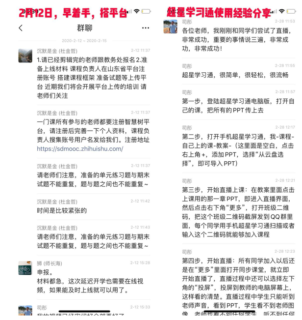 3月2日,网络教学工作正式开启。每位教师授课后,都会在教研室群里分享经验和感受。目前,群里关于在线授课的讨论和分享已超过500条。通过开课前的模拟演练和真正线上教学的实践,总结了一系列实用干货经验,如超星直播可以在线视频直播,也可以“屏幕共享+声音直播”;直播结束后要点击保留视频,方便同学回看自主学习;学习通签到比QQ群签到更易保留教学记录,建议用学习通签到等。