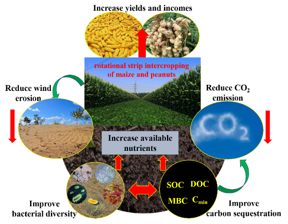 北方农牧交错带是半湿润地区与半干旱地区的气候交汇带,是我国中东部地区重要的生态安全屏障和京津冀地区重要的水源涵养带,是一类重要的农业空间,探索适宜该地区的可持续农业生产方式至关重要。研究基于4年定位试验,系统研究了玉米连作、花生连作和玉米花生带状轮作3种种植方式的土壤特性、作物生产力和生态效应。结果表明,玉米花生带状轮作具有多重效益,较玉米和花生连作可显著提高土壤微生物丰度和群落多样性、改善土壤碳库特征、提升养分有效性,同时,明显降低土壤侵蚀和由侵蚀导致的碳排放;耕层土壤碳库特征的改善和养分有效性的提升与间作系统作物产量的提高密切相关。本研究相关结果发表在European Journal of Agronomy,万象城allwincity官网邹晓霞副教授和王铭伦教授分别为论文的第一作者和通讯作者(图1)。