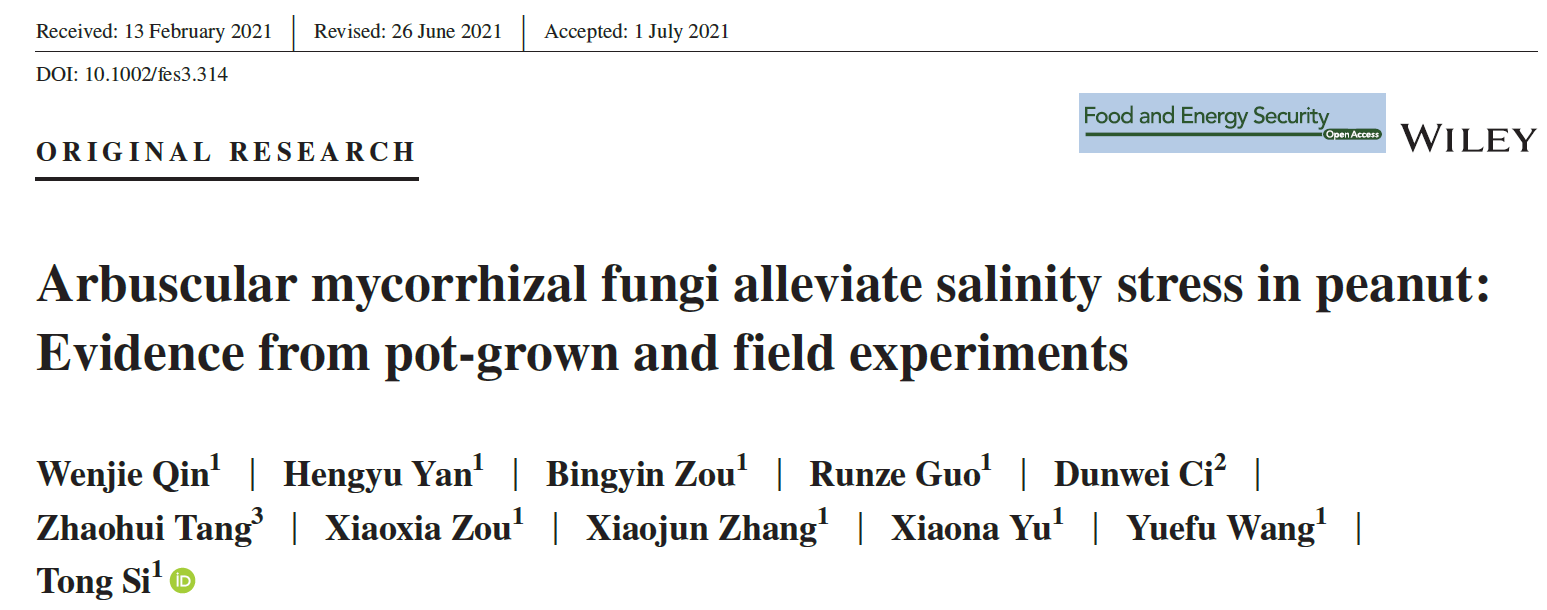 花生是山东省的主要经济作物和我国的重要出口作物。通过接种丛枝菌根真菌(AMF)与花生共生,进而提高花生幼苗素质和耐盐性,是实现用地养地相结合、促进我省滨海盐碱地花生产业可持续发展的重要途径。课题组对花生接种了一种新型配方的AMF进行预处理,开展了盆栽试验和两年大田试验。生理数据分析表明,AMF显著提高了盐胁迫下花生叶片净光合速率、叶绿素荧光相关参数、抗氧化酶活性、渗透调节物质含量,提高了花生地上部分和地下部分的生物量。转录组数据分析表明,AMF处理显著提高了盐胁迫下花生根系抗氧化系统和多种代谢途径的基因表达水平。大田试验进一步证明,接种AMF处理显著提高了盐碱地和非盐碱地花生籽粒蛋白质含量及总产量。本研究为在大田条件下推广该新型AMF提高花生耐盐性和产量提供了理论依据和技术支撑。本研究相关结果发表在Food and Energy Security,万象城allwincity官网硕士研究生秦文洁、青年教师闫恒宇博士和司彤博士分别为第一作者、共同第一作者和通讯作者(图2)。