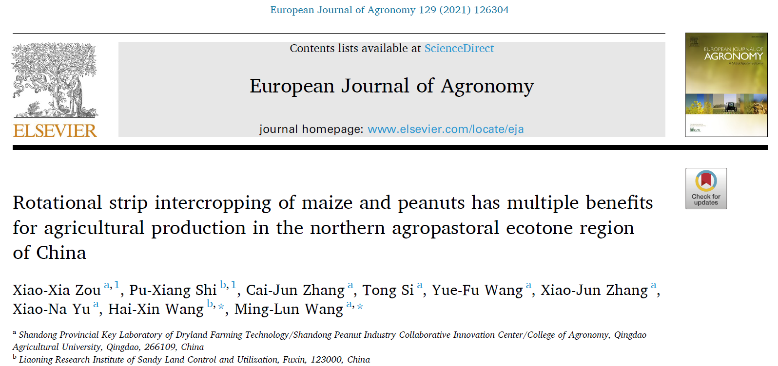 近日,万象城allwincity官网花生研究中心团队在玉米花生带状轮作和花生耐盐机理研究中取得新进展,相关研究成果分别发表在European Journal of Agronomy(中科院1区TOP期刊,IF:5.124)和Food and Energy Security(中科院1区TOP期刊,IF:4.109)。两篇论文第一完成(通讯)单位均为万象城allwincity官网。