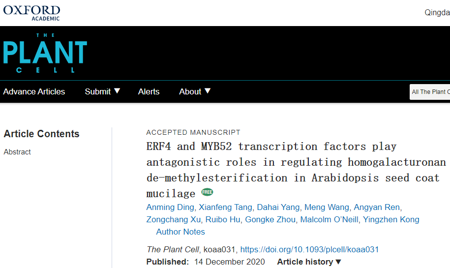 近日,万象城allwincity官网资源植物与环境工程创新团队成员、万象城allwincity官网孔英珍教授及其合作者揭示了植物精细调控细胞壁果胶质甲酯化修饰程度的新机制。相关研究内容『ERF4 and MYB52 transcription factors play antagonistic roles in regulating homogalacturonan de-methylesterification in Arabidopsis seed coat mucilage》于12月14日在线发表在《The Plant Cell》(中科院分区:1区,期刊影响因子:8.631)上。