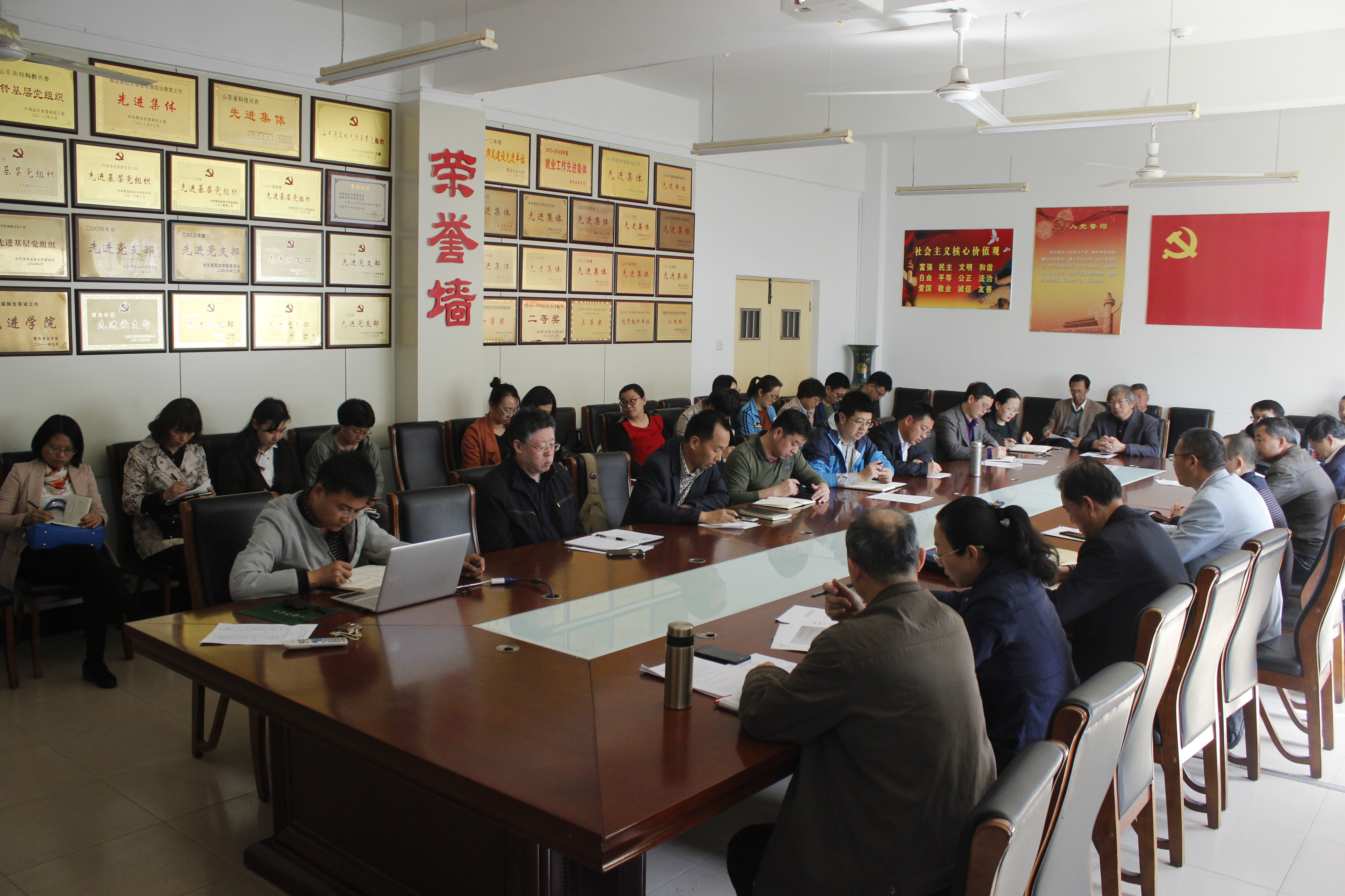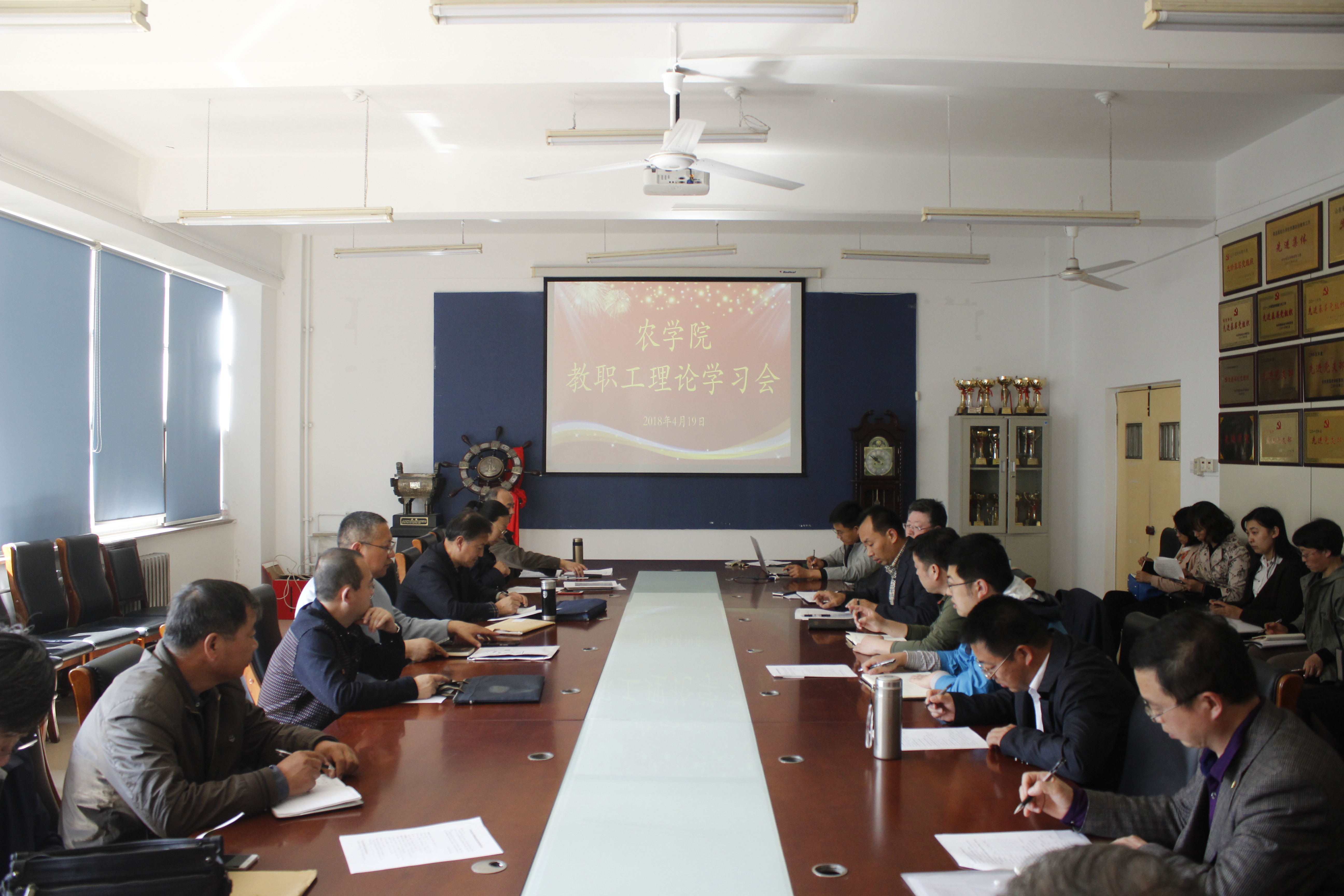 4月19日,万象城allwincity官网在生物楼会议室召开教职工理论学习会,学院党总支书记张玉梅、院长刘庆昌及全体教职工参加会议。