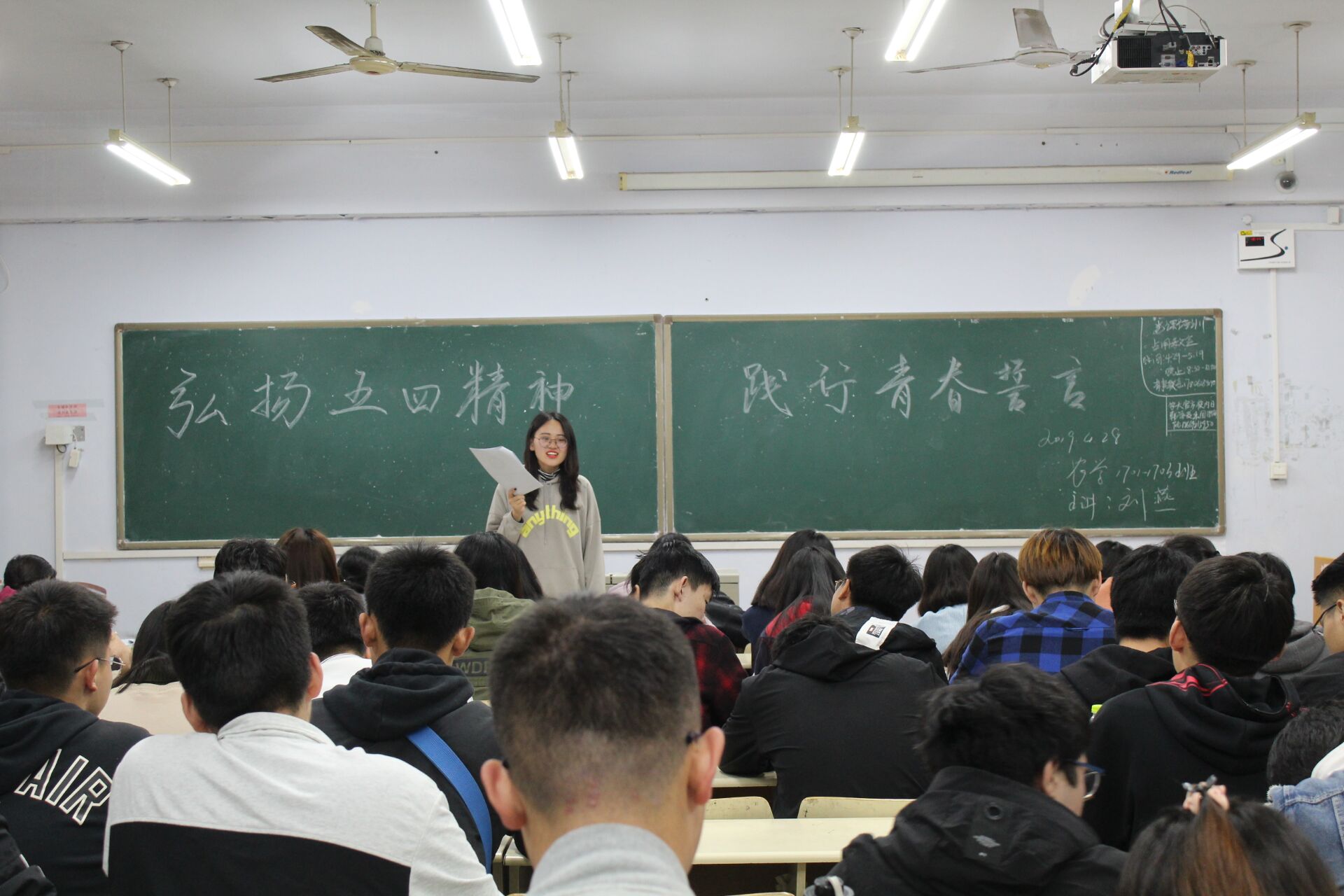 4月28日,万象城allwincity官网于教学区开展“弘扬五四精神,践行青春誓言”主题团课,旨在让同学们了解五四运动,弘扬五四精神。学院2017、2018级同学积极参加。