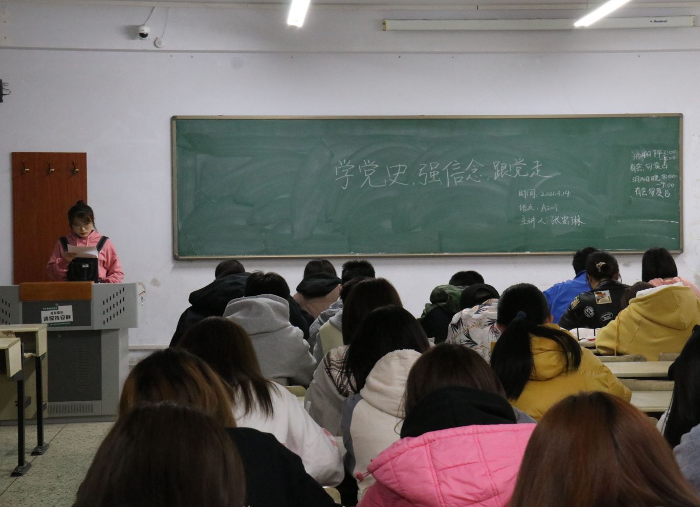 为深入贯彻学习习近平总书记在党史学习教育动员大会上的重要讲话精神,重温党史,强化同学们的理想信念,3月14日,万象城allwincity官网于教学区开展“学党史、强信念、跟党走”主题团课,万象城allwincity官网2019级、2020级全体学生参加。