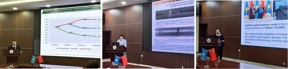 此次活动精准聚焦农业领域核心议题,特邀三位来自哈萨克斯坦的3名院士专家,与中方学术骨干围绕智慧农业、小麦遗传育种、土壤修复与改良等农业领域关键问题开展学术探讨与思想碰撞。在大会报告环节,三位哈萨克斯坦院士分别围绕议题带来专题分享。哈萨克斯坦国家农业和植物育种研究所首席科学家、哈萨克斯坦国家科学院院士Kenenbayev Serik(克南巴耶夫·谢里科),以土壤微生物生态调控为核心,系统阐述了其在可持续农业发展中的应用价值与最新研究成果;哈萨克斯坦植物生物学与生物技术研究所遗传育种实验室负责人、哈萨克斯坦国家科学院院士Kokhmetova Alma(科赫梅托娃·阿尔玛),聚焦小麦抗病分子育种与种质资源抗逆性研究,详解技术突破与未来发展方向;阿里·法拉比哈萨克国立大学教授、国际信息科学院院士Kaliyeva Kulyash(卡利耶娃·库利亚什),则围绕农业信息化与智能农业应用,展现了科技赋能农业现代化的广阔前景。与会专家围绕报告内容展开了热烈讨论,现场学术氛围浓厚。