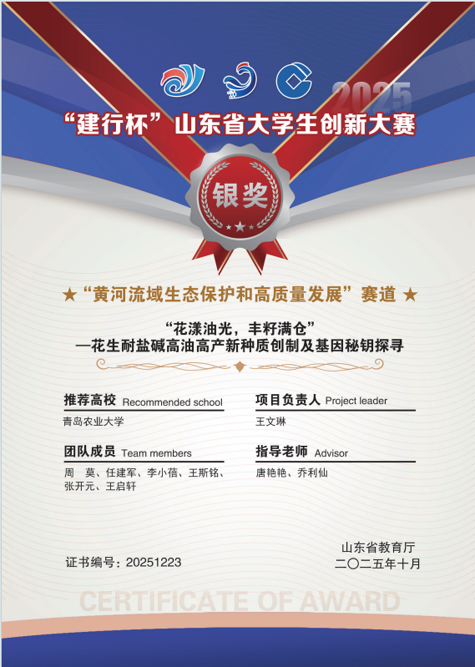 在“建行杯”山东省大学生创新大赛(2025)暨中国国际大学生创新大赛 (2025)山东赛区选拔赛中,我院推荐参赛项目《“花漾油光,丰籽满仓”——花生耐盐碱高油高产新种质创制及基因密钥探寻》历经多轮激烈比拼,最终斩获山东赛区银奖,展现了学院在创新创业教育方面的扎实成效。