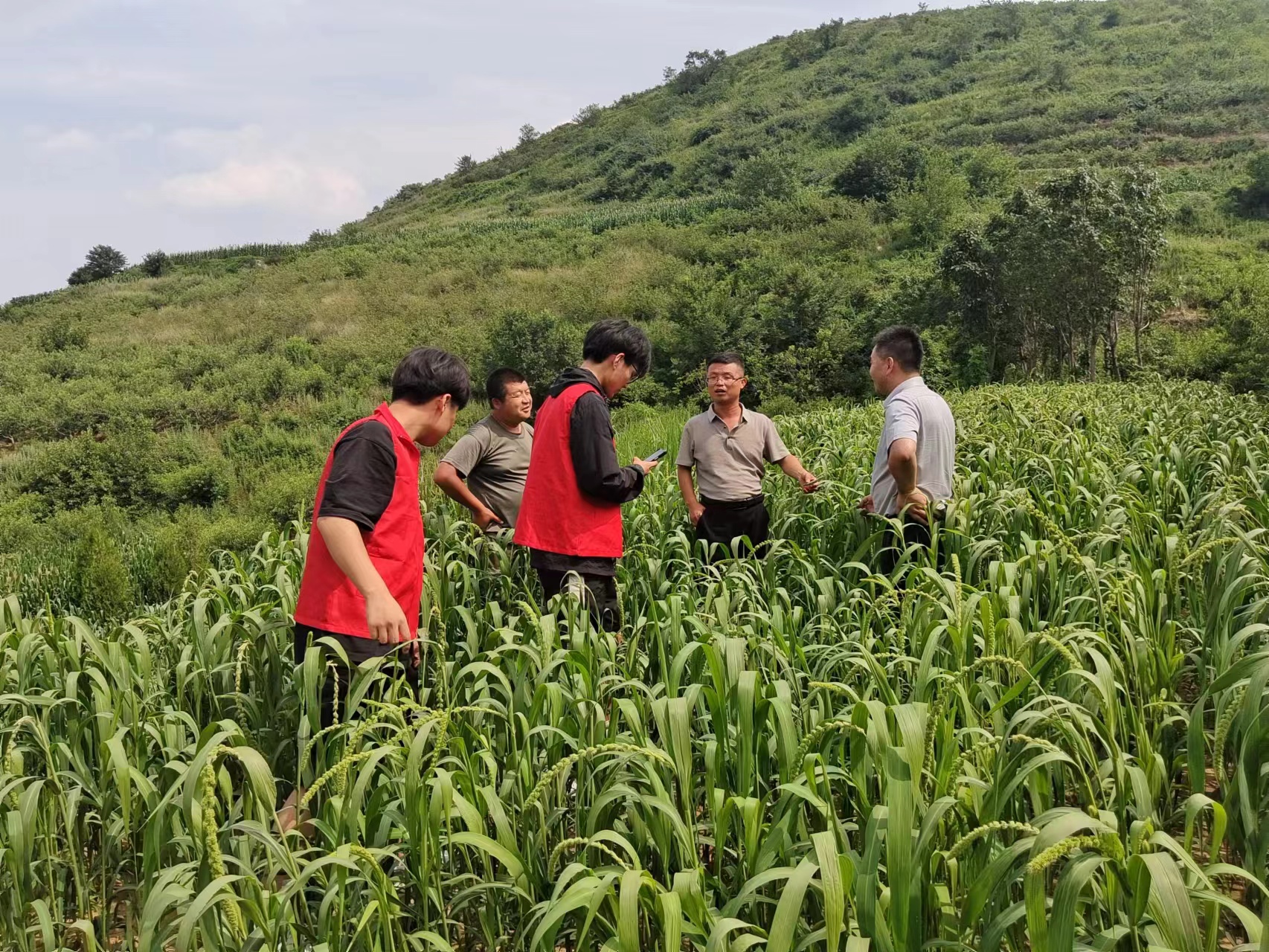 19日上午,实践服务团成员到达临朐山旺镇解家河村,实地考察调研黄小米的生长情况。山旺镇副镇长寇镇玺介绍了黄小米从播种到收割各个阶段的时令气候、方式方法、注意事项以及黄小米售卖的市场行情。下午,实践服务团成员与当地村民进行了访谈,了解到部分村民除种小米等作物外,在农忙之余也能通过打工增加收入,实现收入多元化。实践服务团成员也对未来公费农科生步入社会后的工作环境、职责等有了一定的了解。