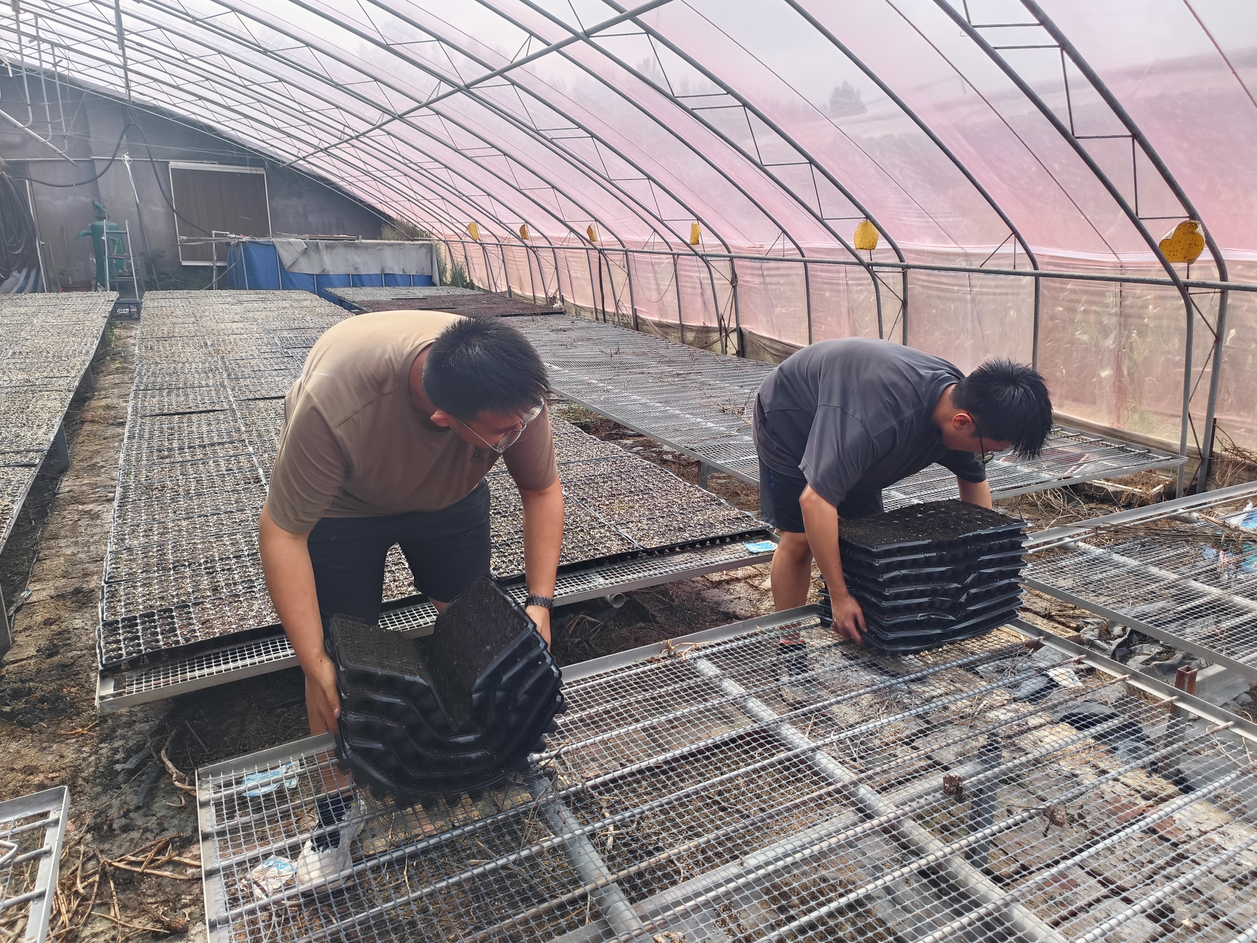 经过讲解和示范指导,团队成员逐渐掌握了基质栽培的要领和步骤,专心投入到基质栽培实践中,先用铁锨翻拌基质肥料,然后将基质装填进穴盘,摊铺平整后将种子放入穴盘,最后将穴盘搬运至大棚。栽培过程中团队成员分工有序、有条不紊,在大家的共同努力下,协助完成了100余盘72孔穴盘填料和播种。
